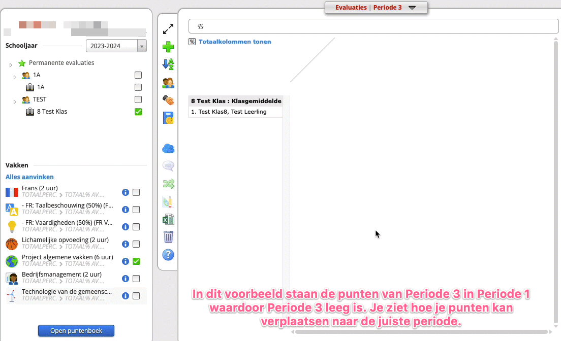 - Selecteer de periode waar de punten verkeerd staan (bijvoorbeeld Periode 1).